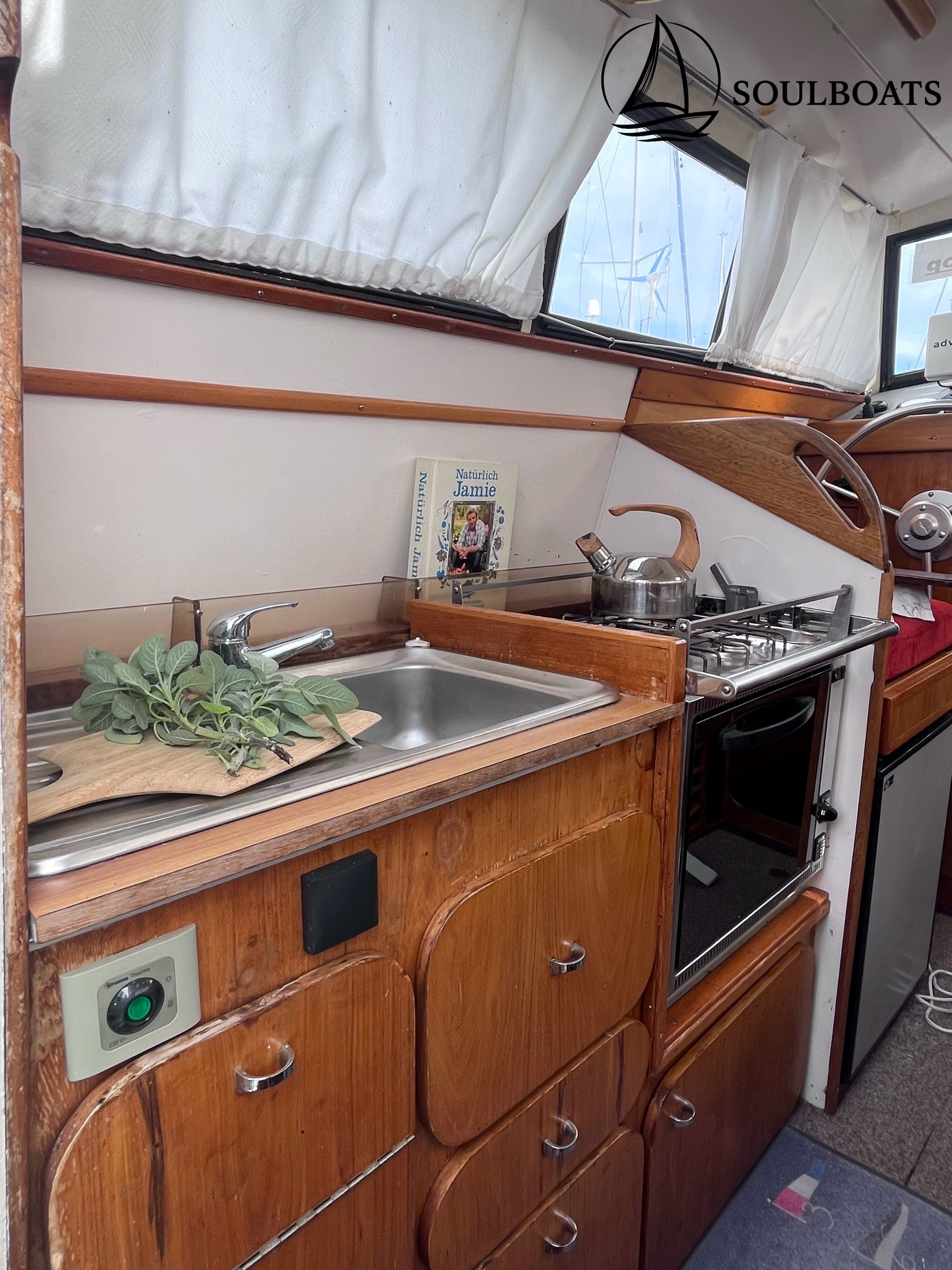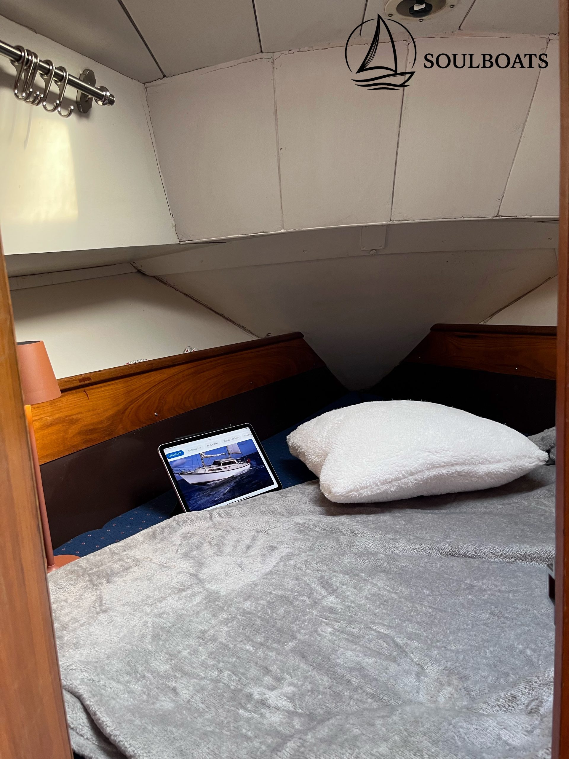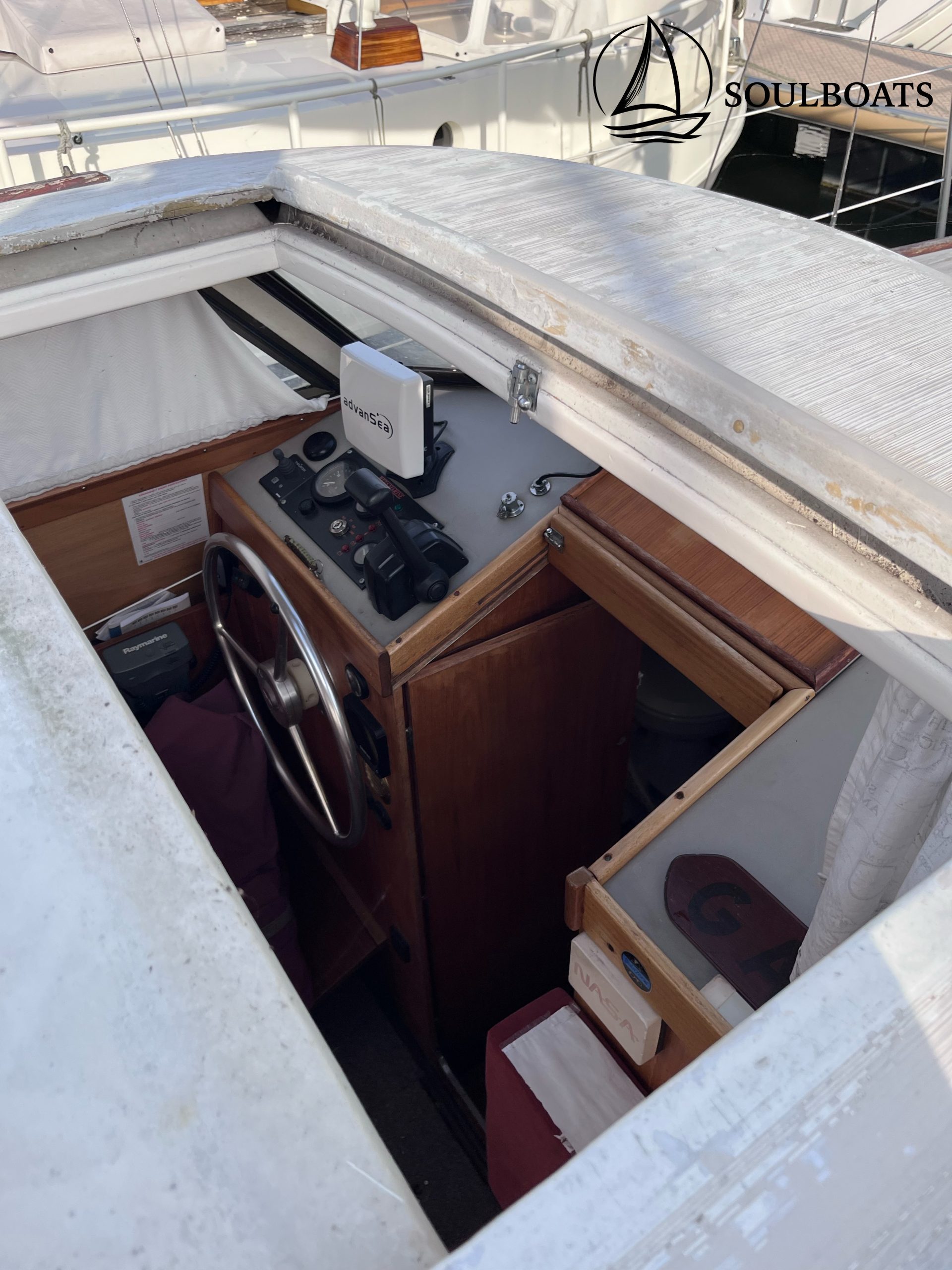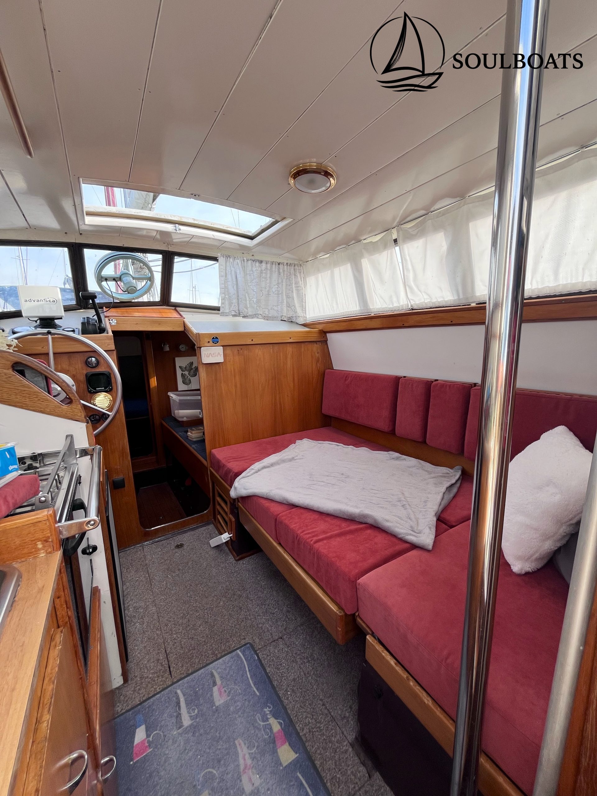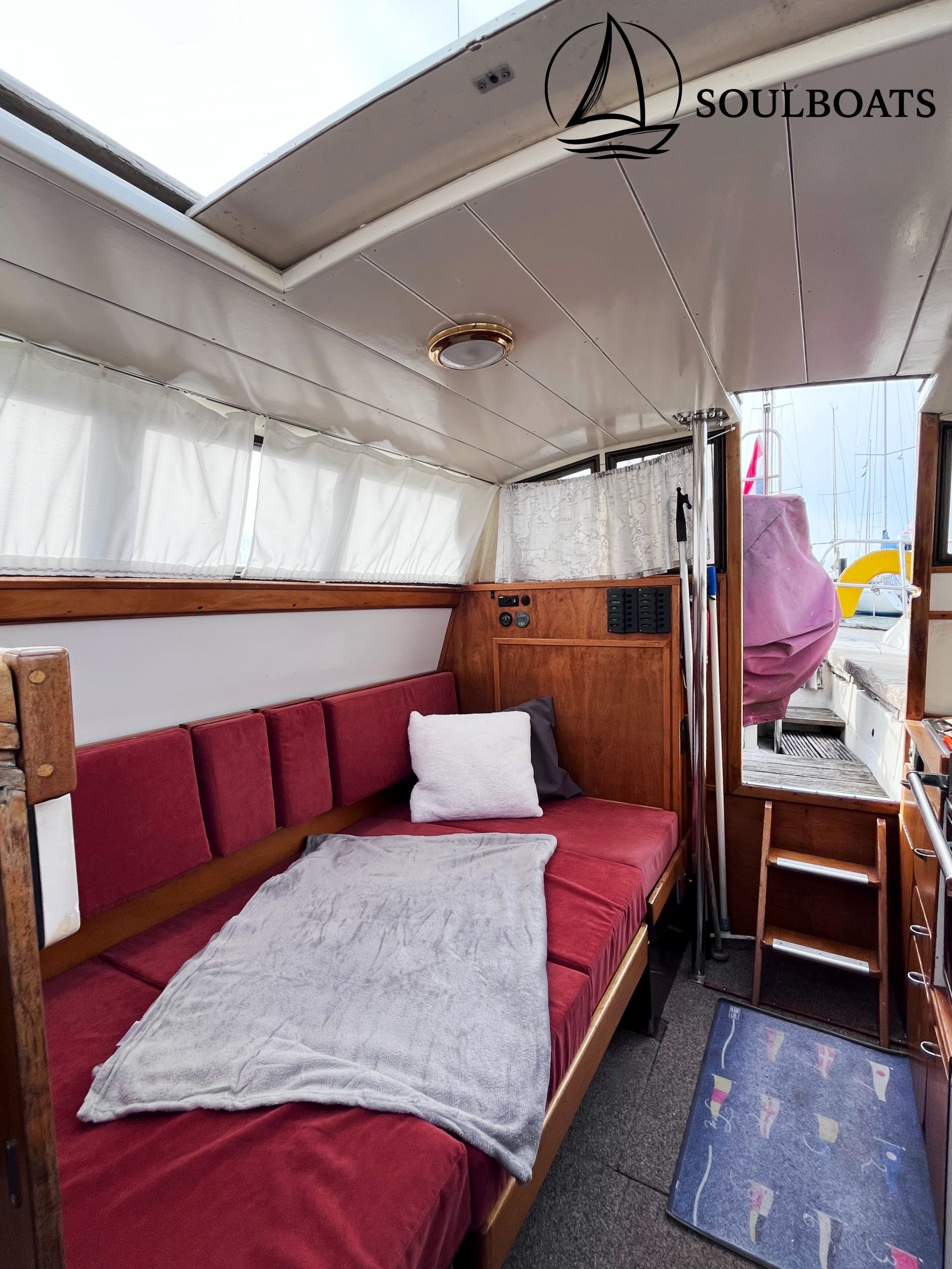Technisch befindet sich das Schiff in ausgezeichnetem Zustand, alle Geräte sind funktionsfähig. Optisch innen könnten kleinere Lackierarbeiten vorgenommen werden. Außen, am Deck, hat ein Vorbesitzer versucht, das Schiff in hellem Weiß erstrahlen zu lassen; die Farbe löst sich jedoch inzwischen ab. Die Reste lassen sich problemlos entfernen, und darunter kommt das originale, gut erhaltene Gelcoat zum Vorschein.