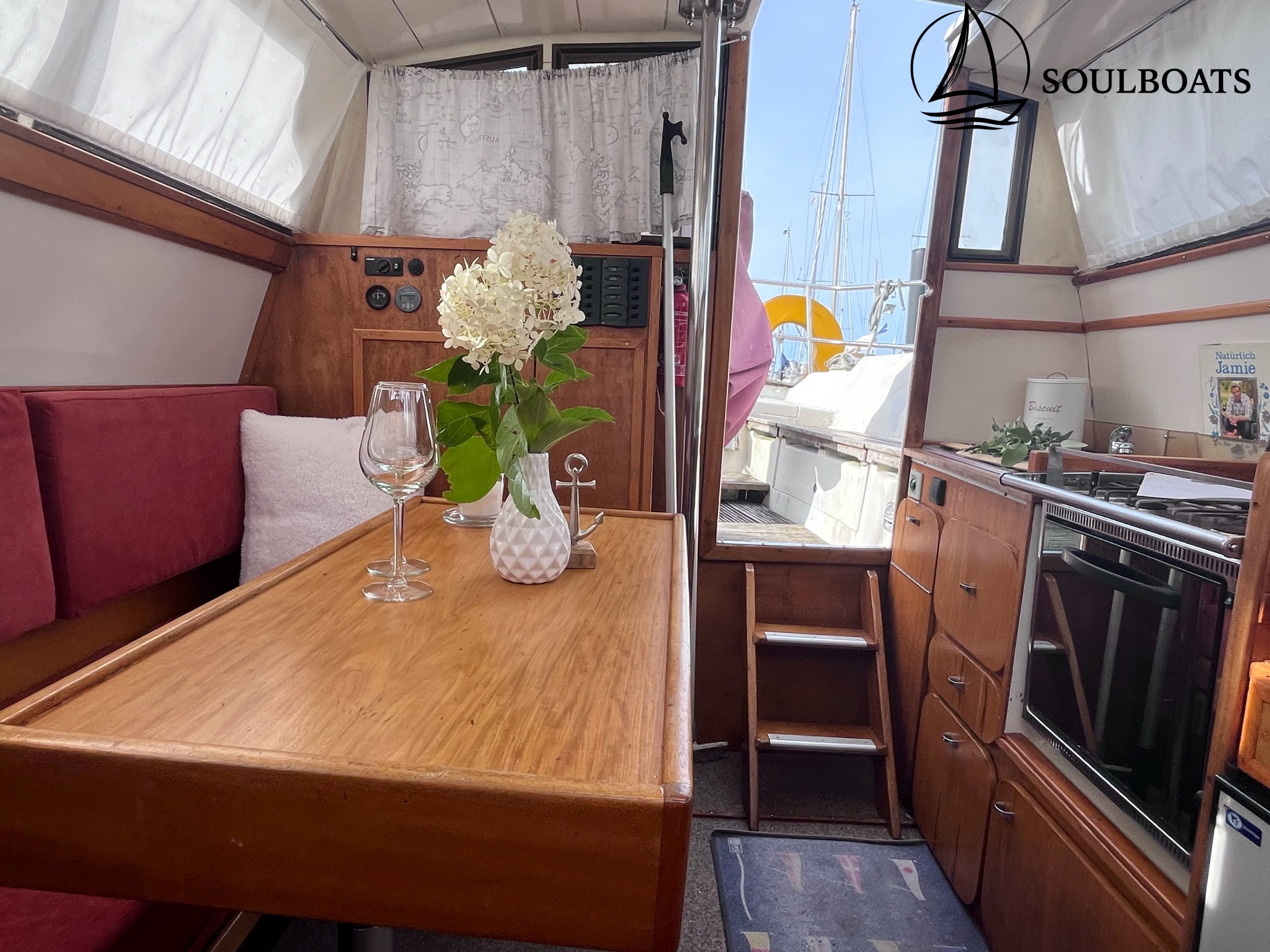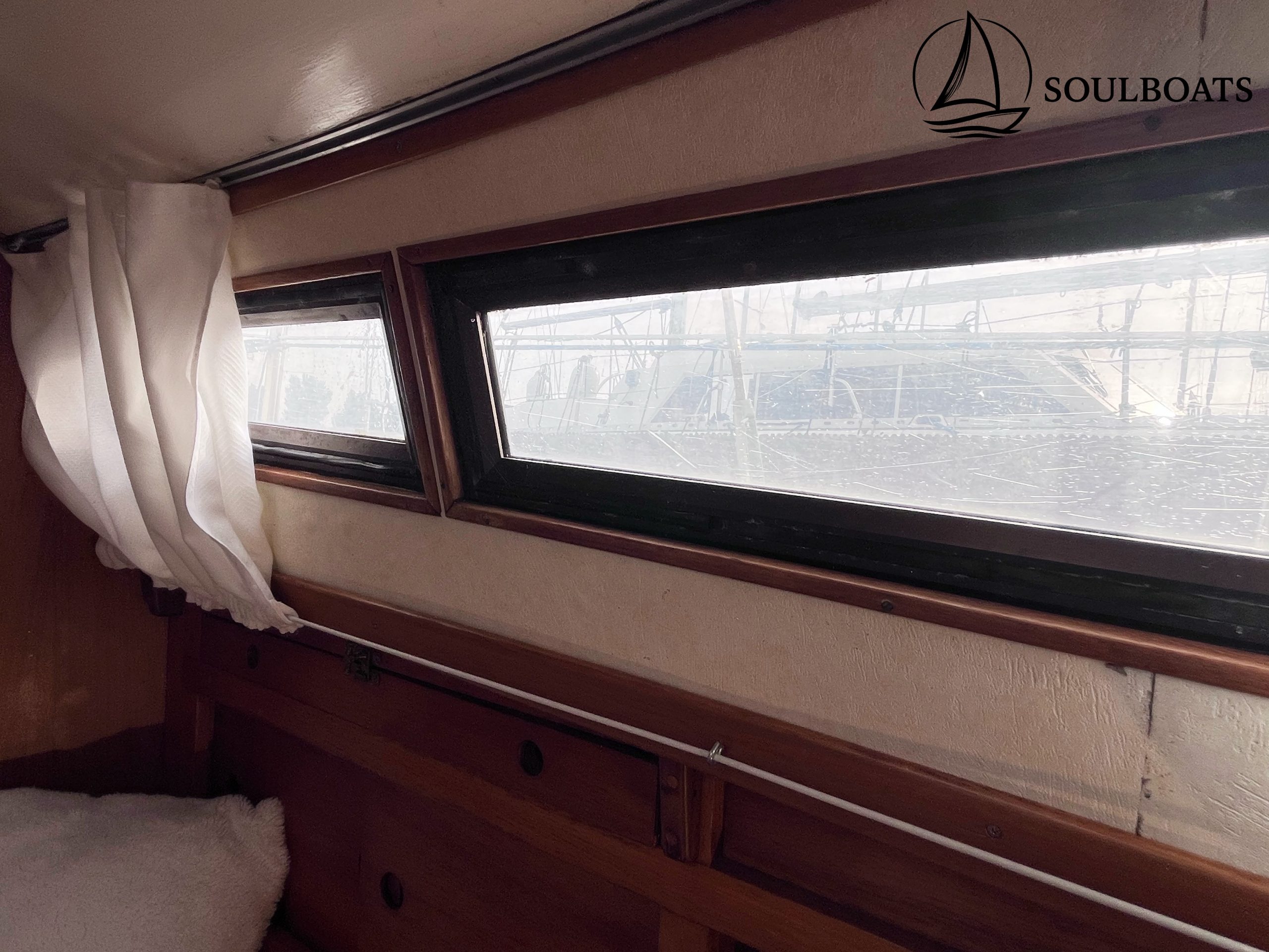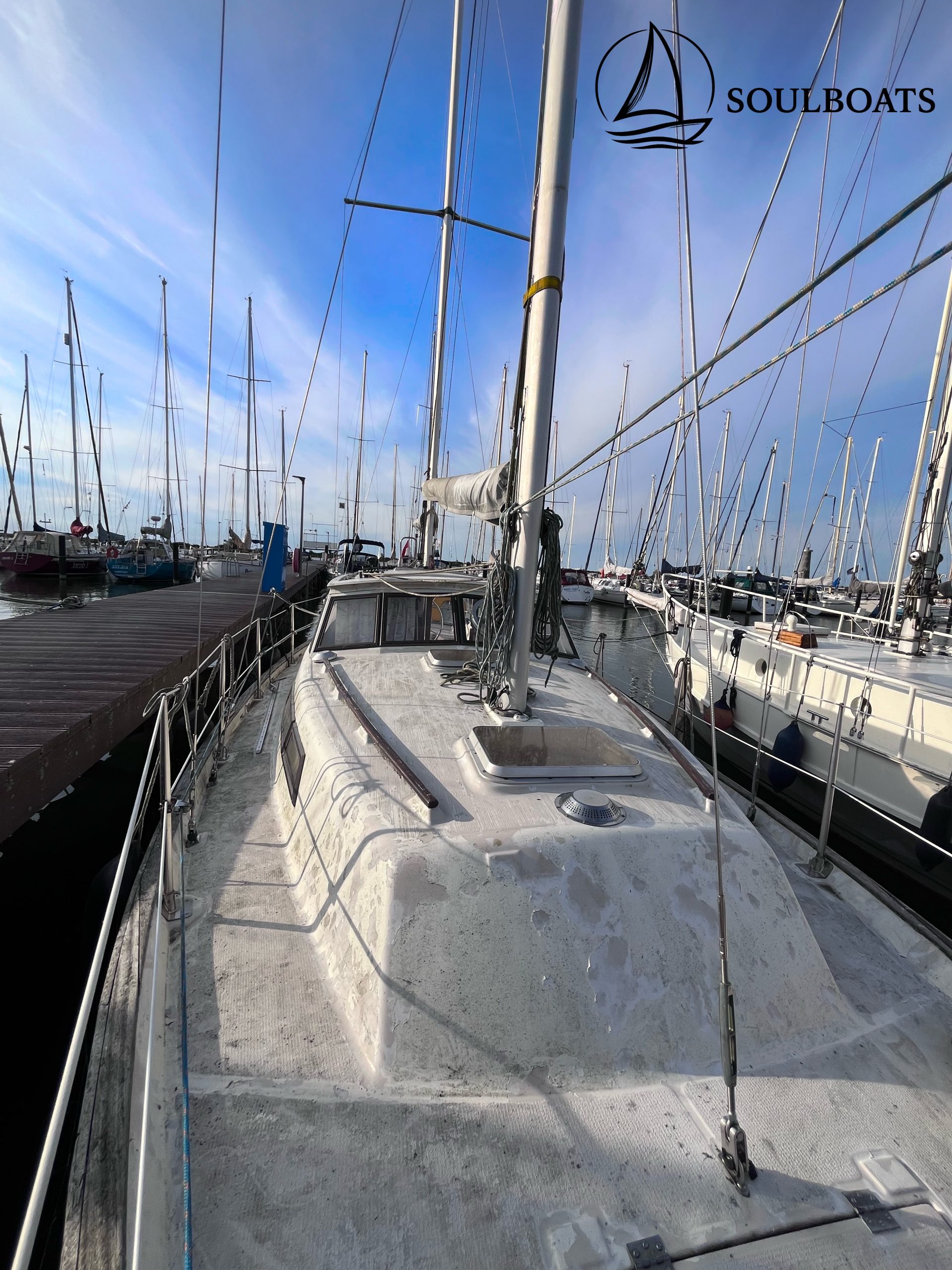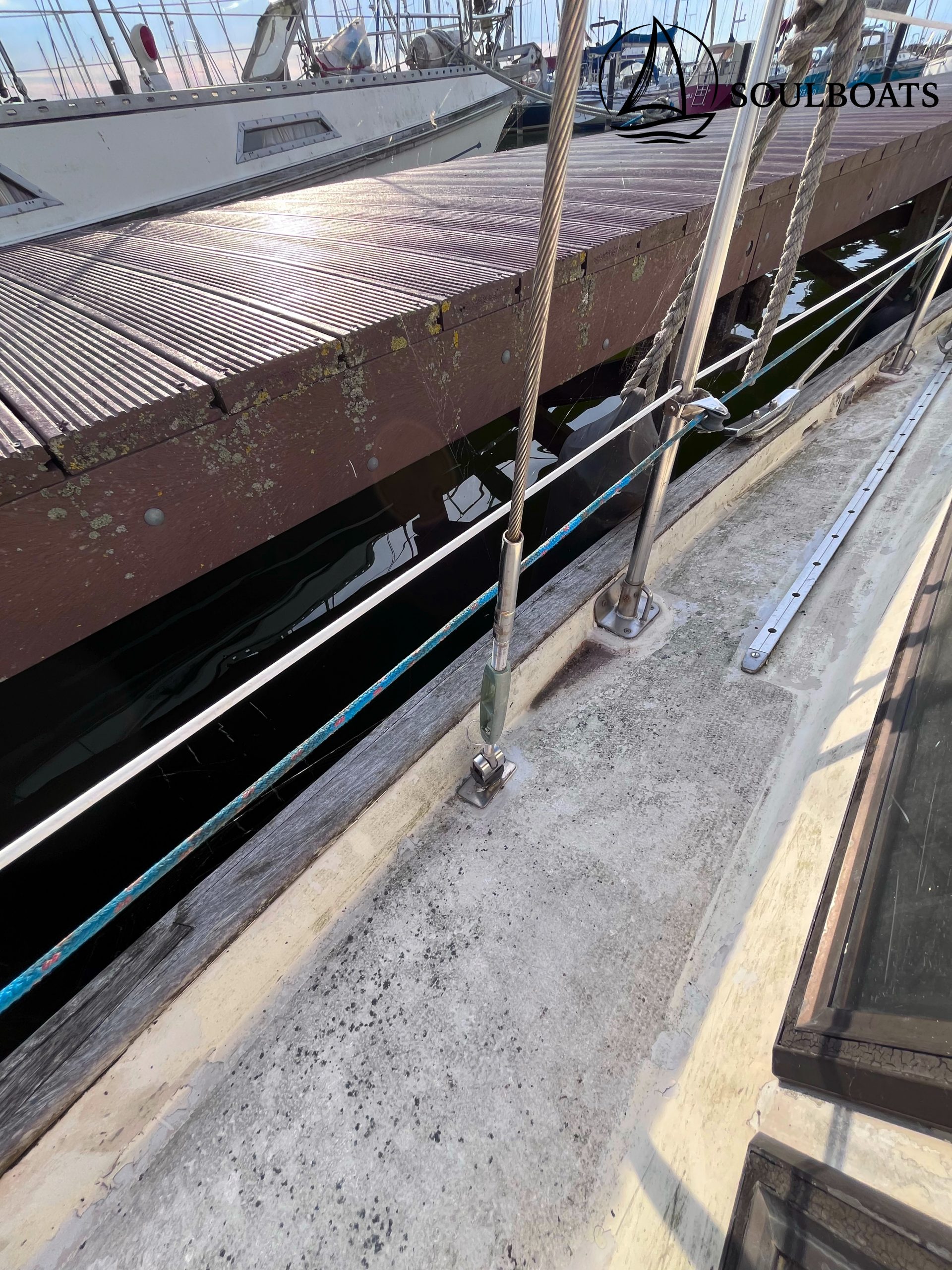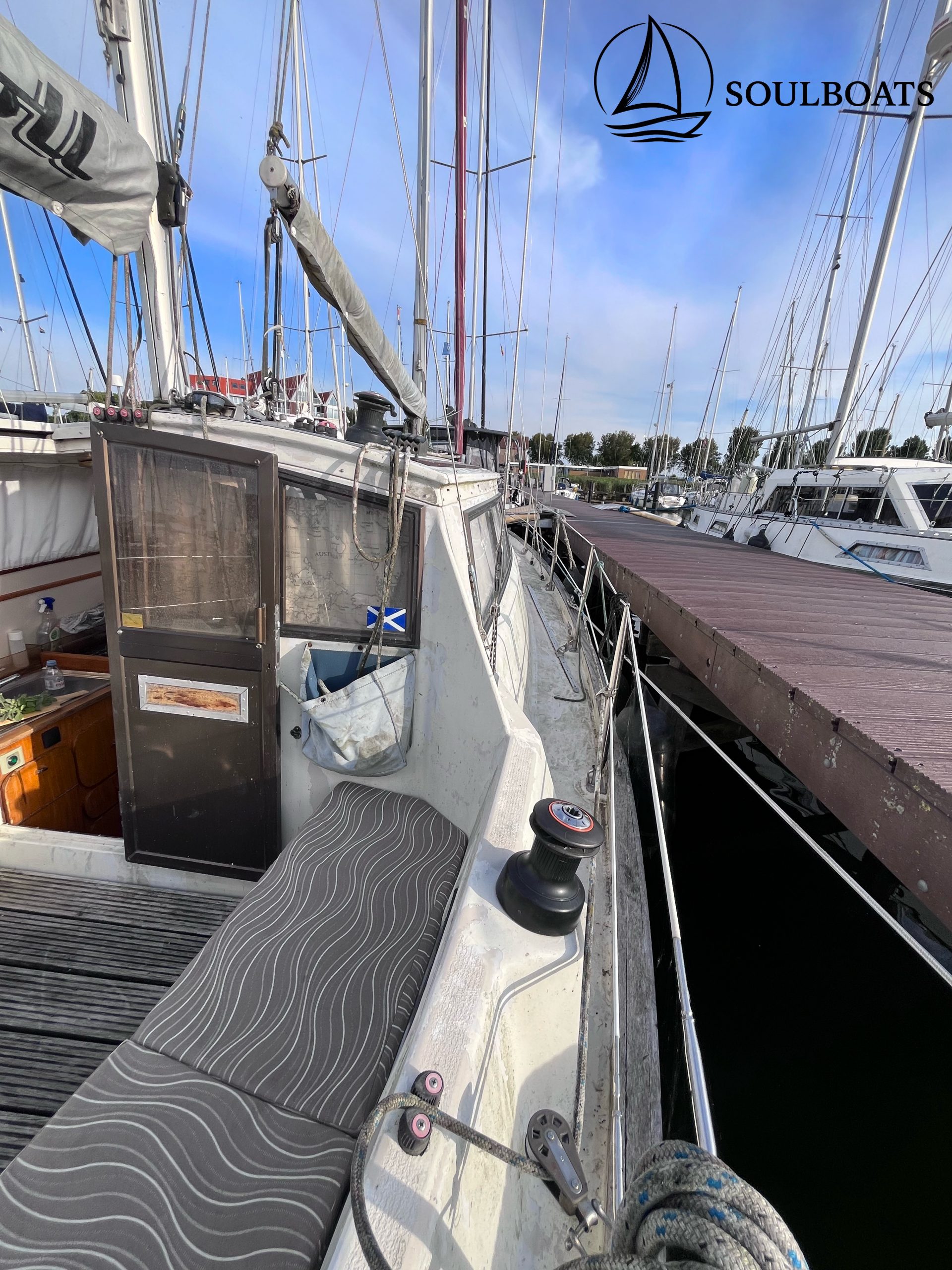 Technisch befindet sich das Schiff in ausgezeichnetem Zustand, alle Geräte sind funktionsfähig. Optisch innen könnten kleinere Lackierarbeiten vorgenommen werden. Außen, am Deck, hat ein Vorbesitzer versucht, das Schiff in hellem Weiß erstrahlen zu lassen; die Farbe löst sich jedoch inzwischen ab. Die Reste lassen sich problemlos entfernen, und darunter kommt das originale, gut erhaltene Gelcoat zum Vorschein.